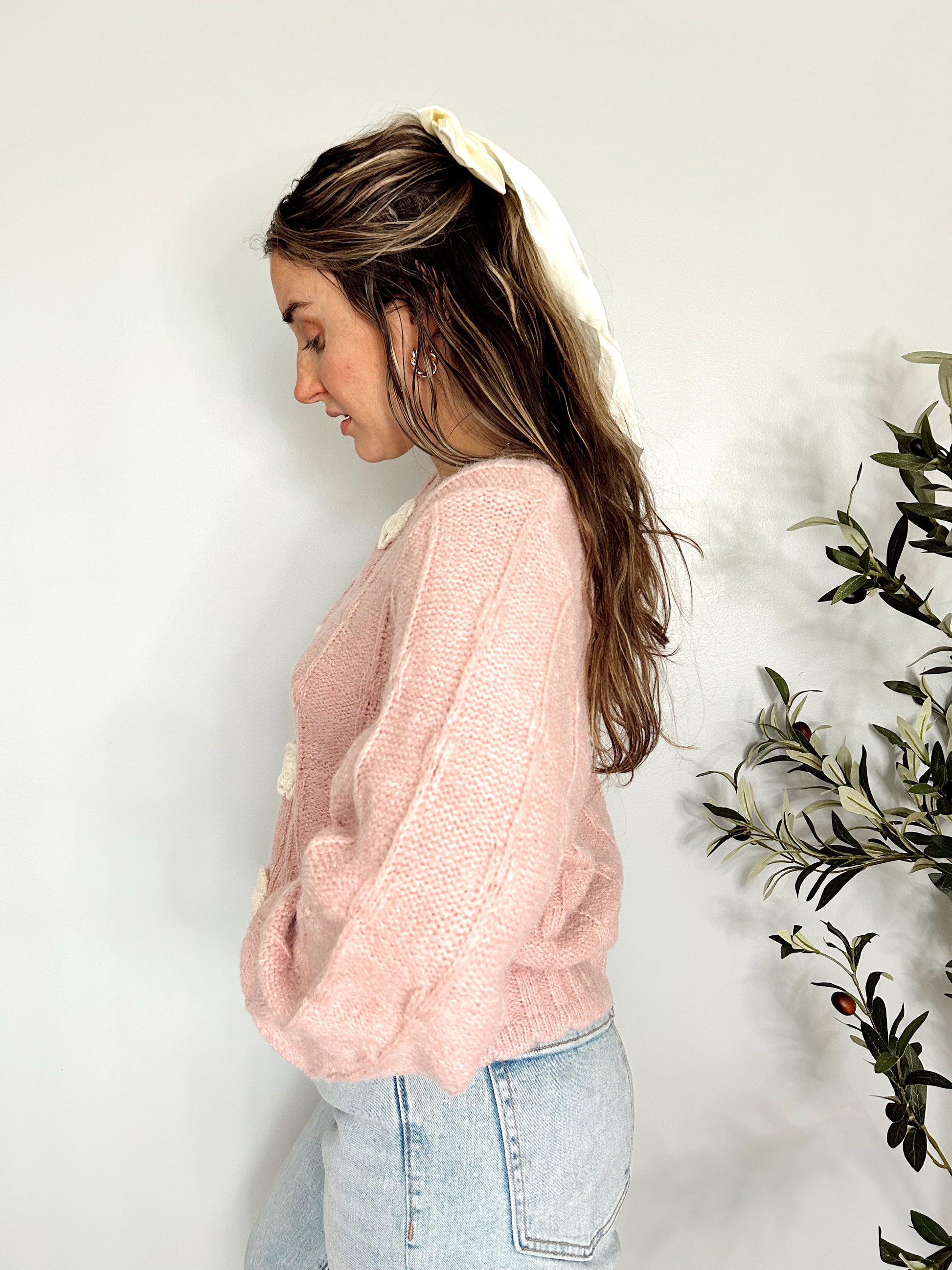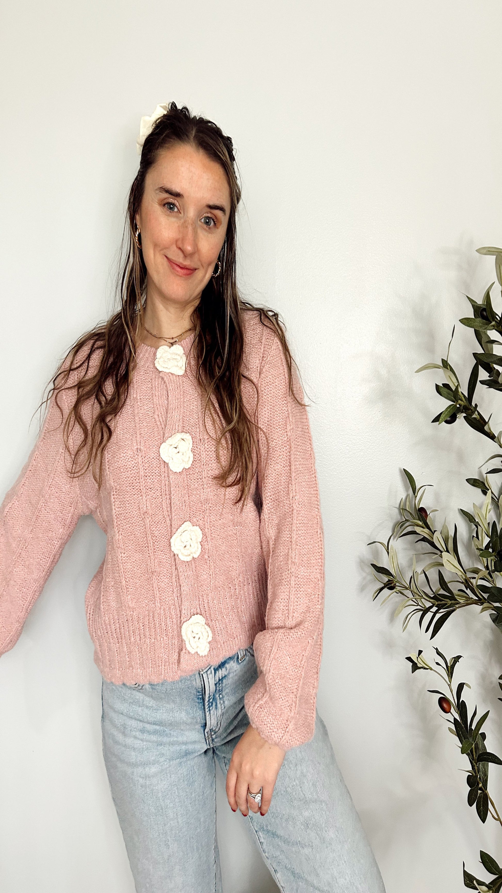Floral Button Crop Length Knit Sweater Cardigan - Floral Collection Round Neck Outerwear - Long Sleeve - Ribbed Hem
