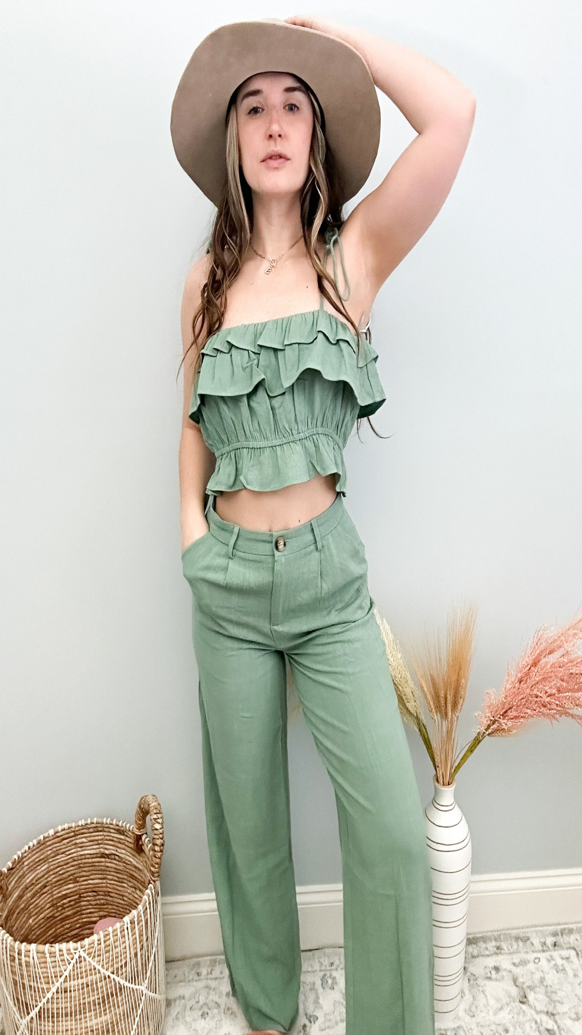 Keep cool under this spring and summer in our flirty light stone sage set featuring lightweight material, a straight smocked neckline with a tie closure adjustable spaghetti straps, and a tiered ruffled silhouette that ends in an uneven cropped hemline! Includes lightweight trousers with functional pockets and belt loops