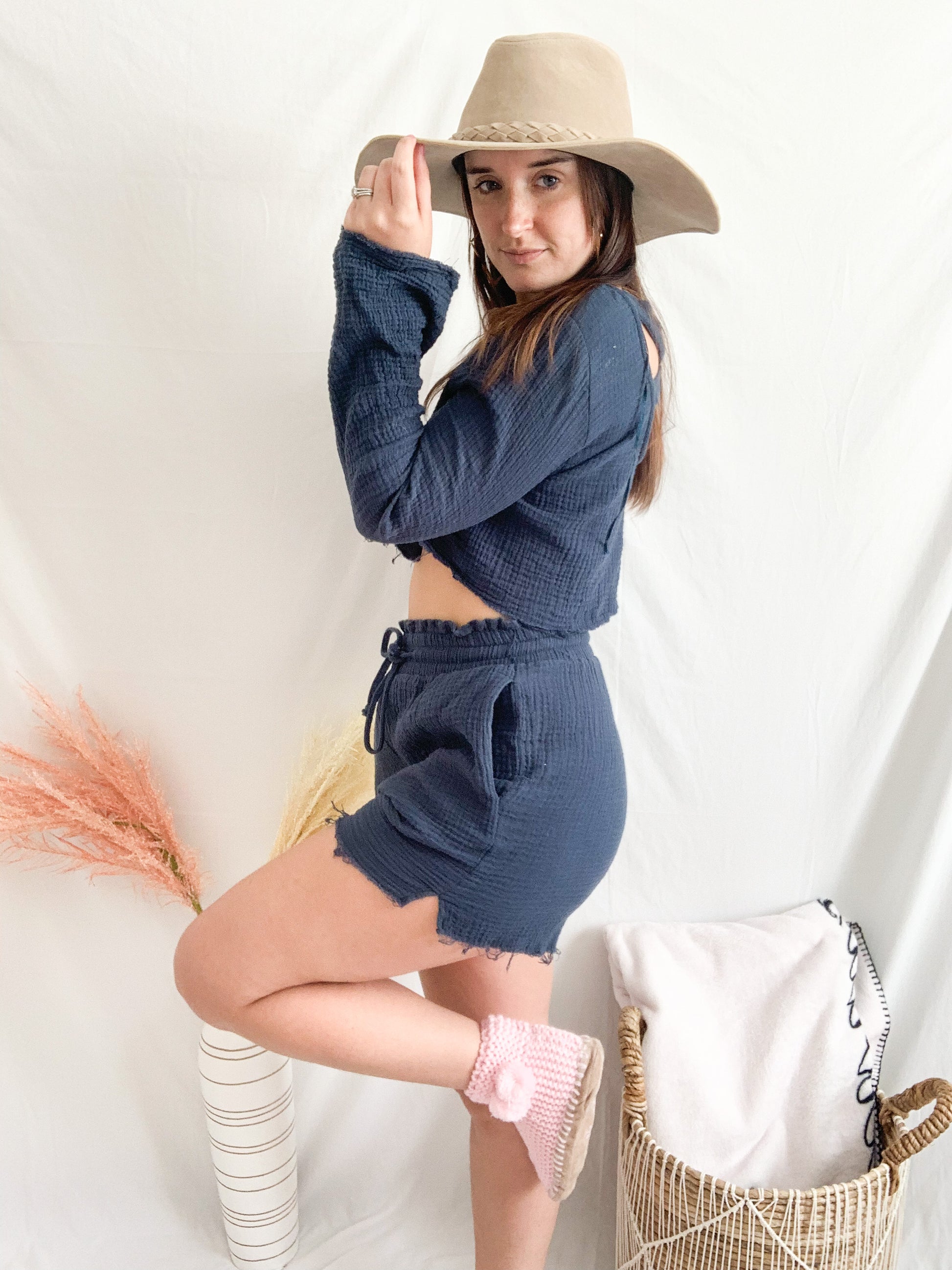 Wake up in style on Drive me Home Set featuring soft lightweight material patterned with a high rounded neckline, long loose boho bell sleeves, and a relaxed silhouette that falls into a straight cropped and cinched hemline with a tie string closure! All you have to do is add some knee high socks or fuzzy slippers for the ultimate cozy two piece look!