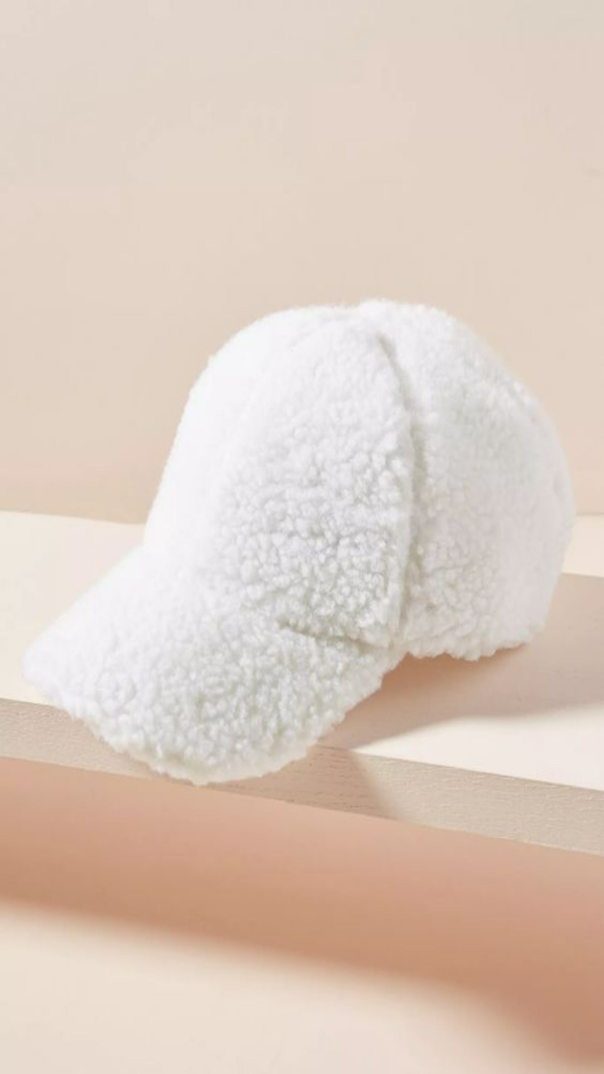 This sherpa baseball cap in beige features a lightweight sherpa material, a metal button, and an adjustable Velcro closure in the back.