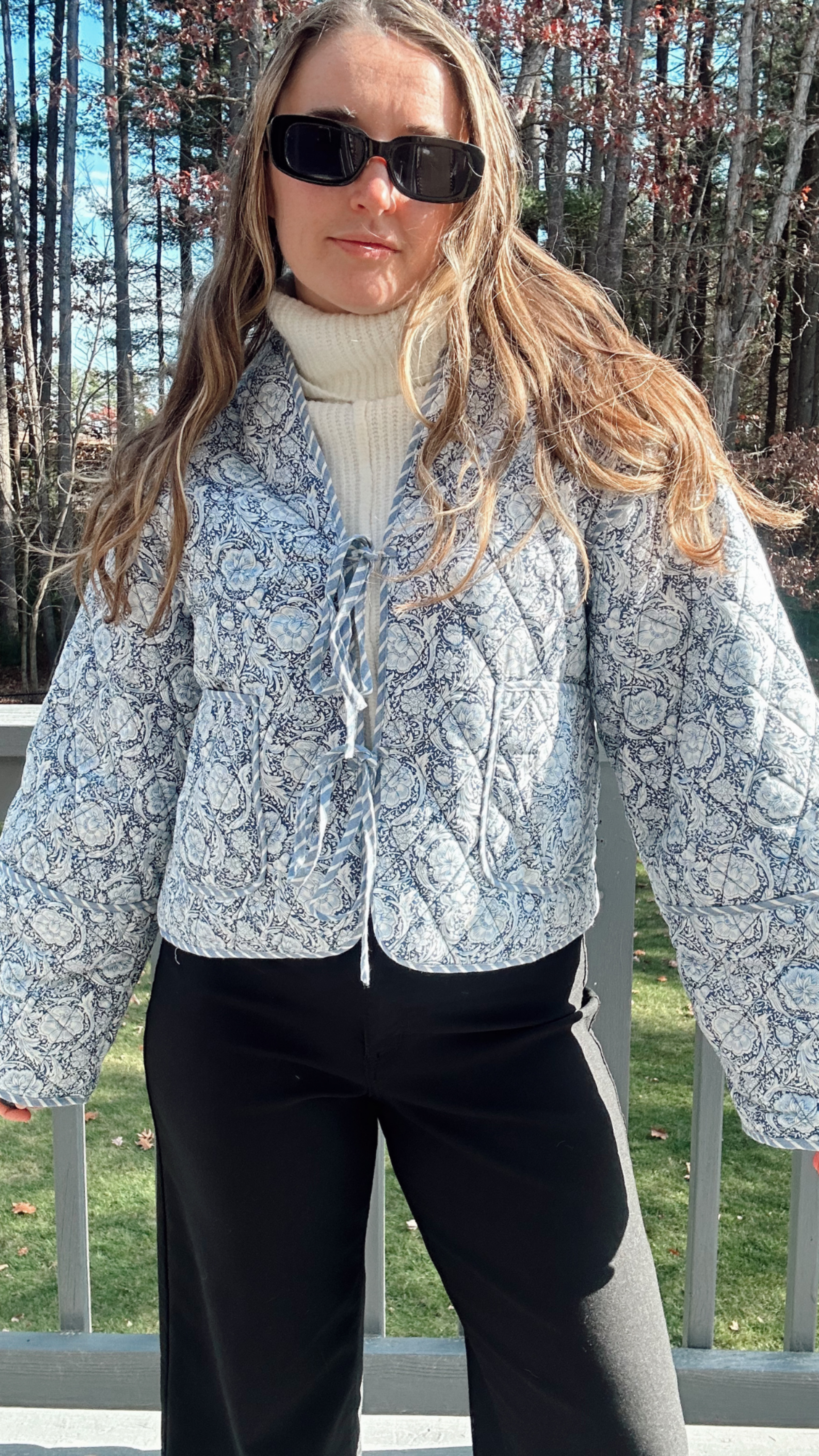Instant sell out! Includes a blue floral paisley print with two self ties. Quilt material will make you feel like you are wrapped up in a cozy blanket by the winter lake.