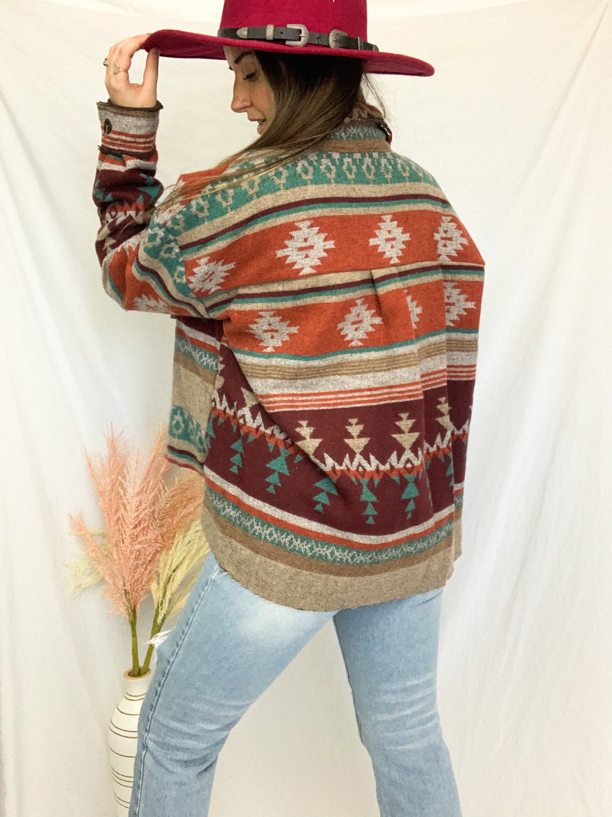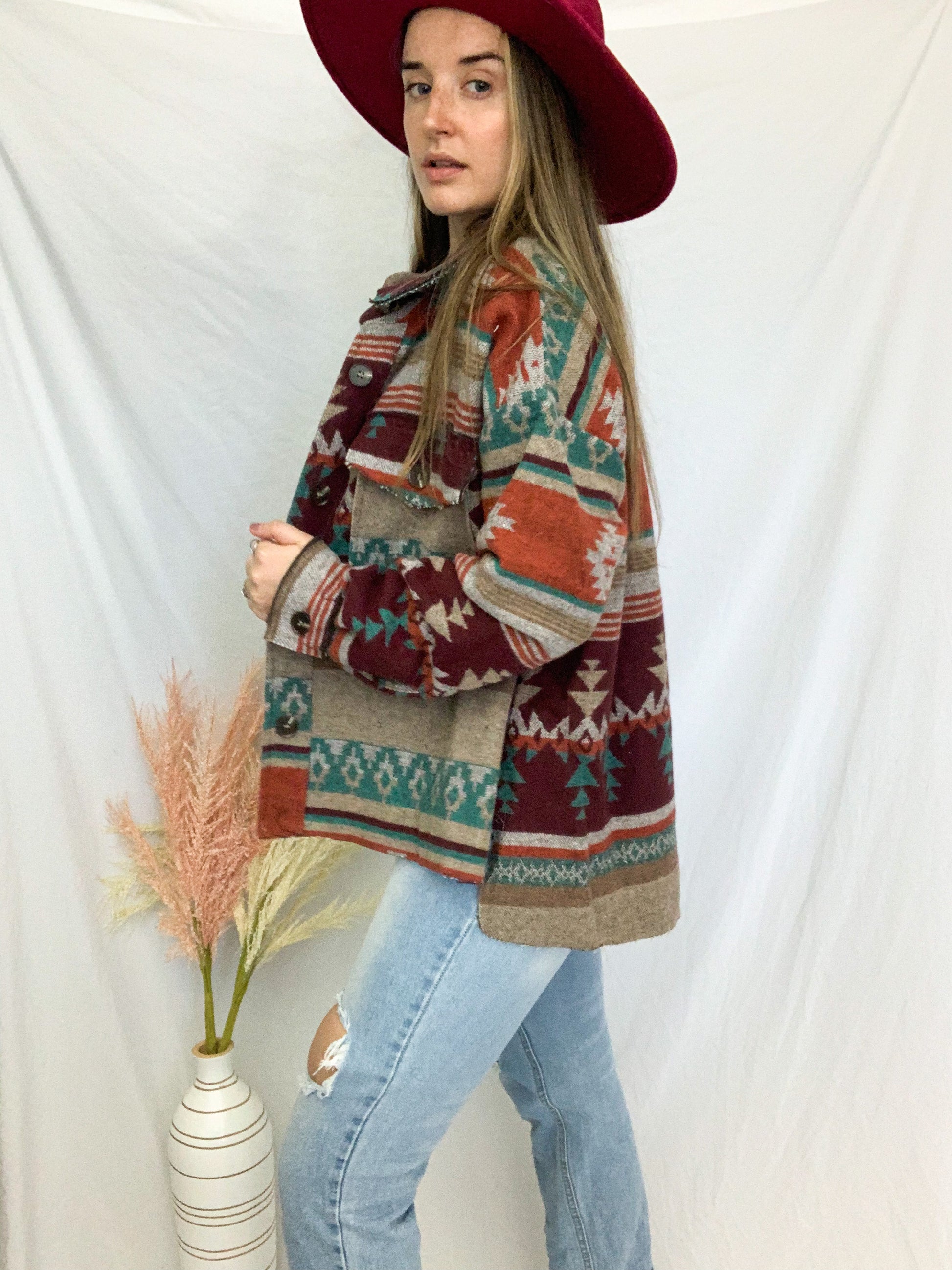 You won't find a more fashionable layering piece than our unique Mariah Aztec Jacket featuring warm material patterned with a sangria, wine, and turquoise hued aztec print, a button down front with a collared neckline long loose sleeves with button closure cuffs, two chest pockets with flap closures, and a relaxed silhouette that falls into a frayed hemline!