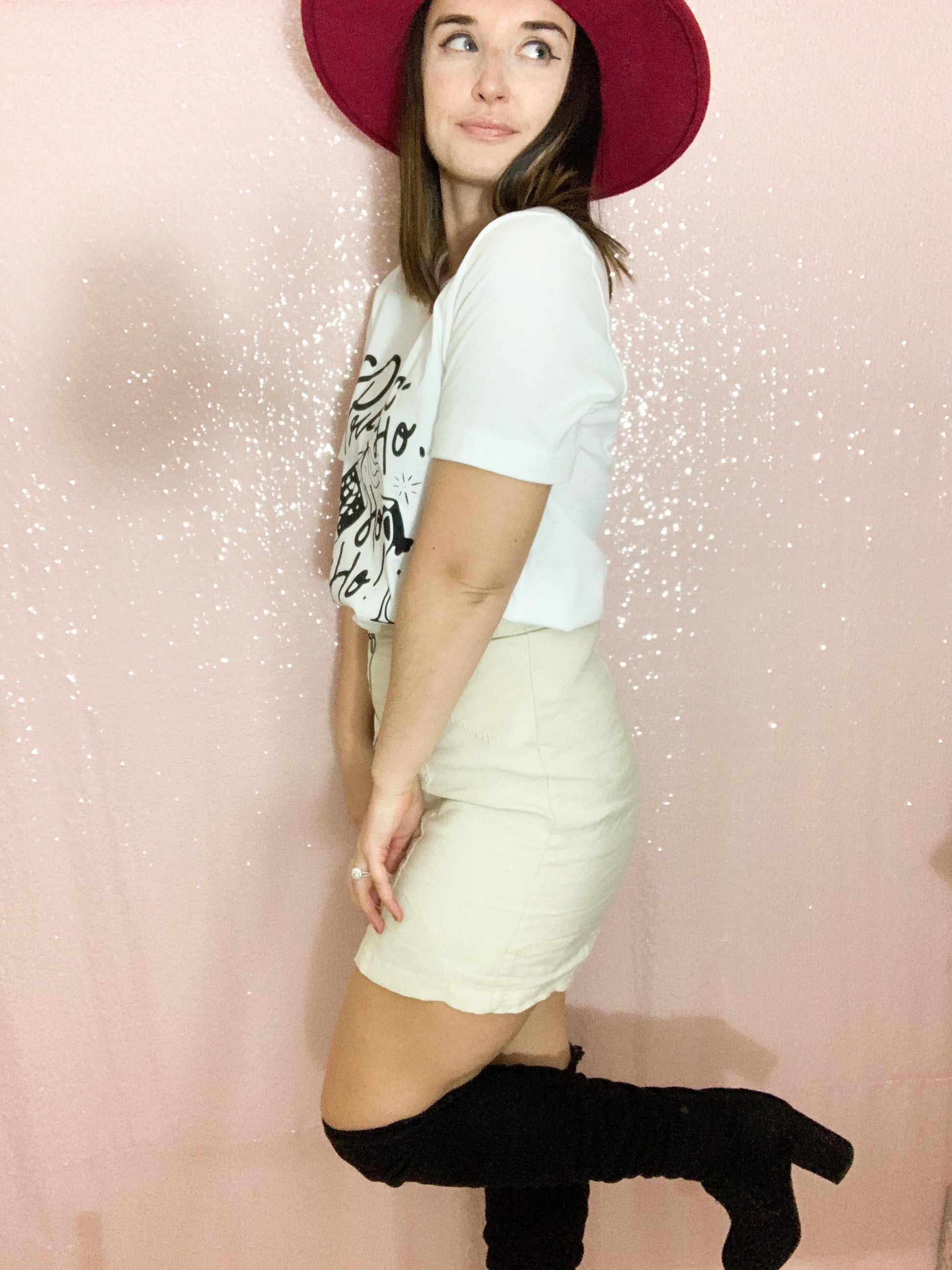 Add a little humor and an extra bit of cheer to your holiday wardrobe with this fun girly top! It features lightweight material, a high rounded neckline, and a short loose sleeves.