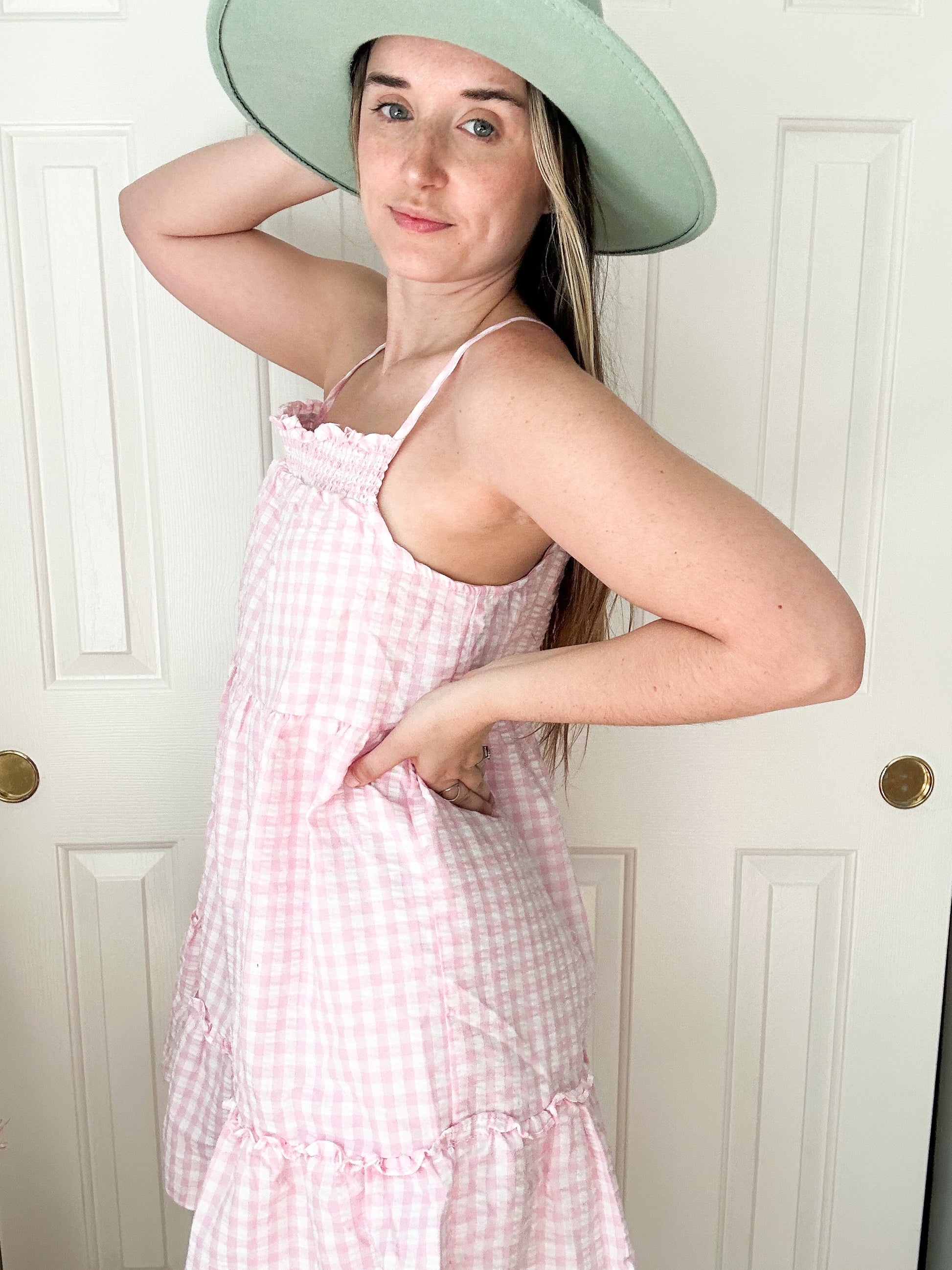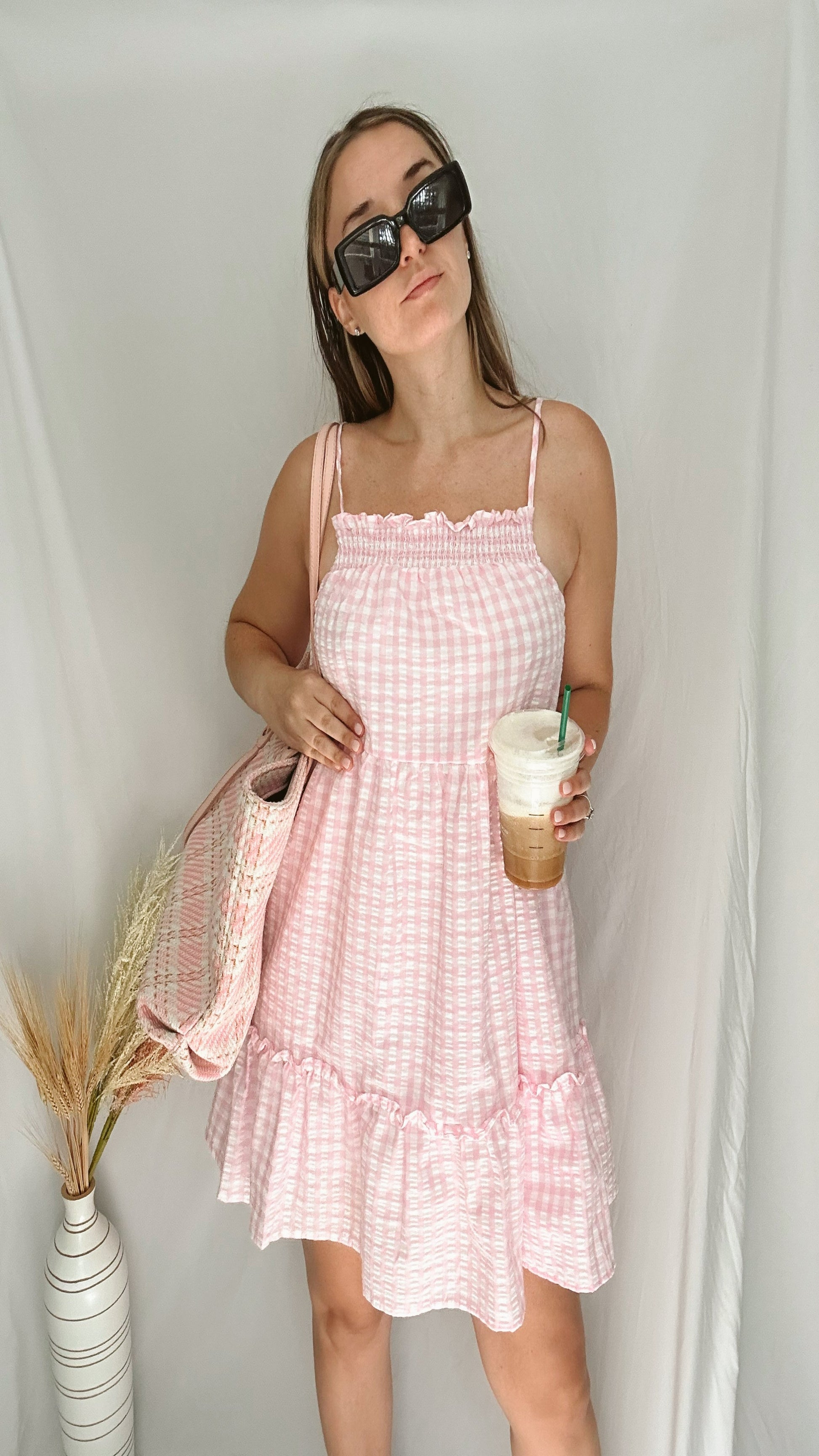We have no doubt you will be instantly impressed when you see how adorable this dress is featuring lightweight material with pink and white checkered detailing, a straight neckline, spaghetti thin straps sleeveless shoulder straps, an open back with a ribbon tie mid-back closure, and a flattering eyelet silhouette that falls into a straight mid-thigh length hemline!
