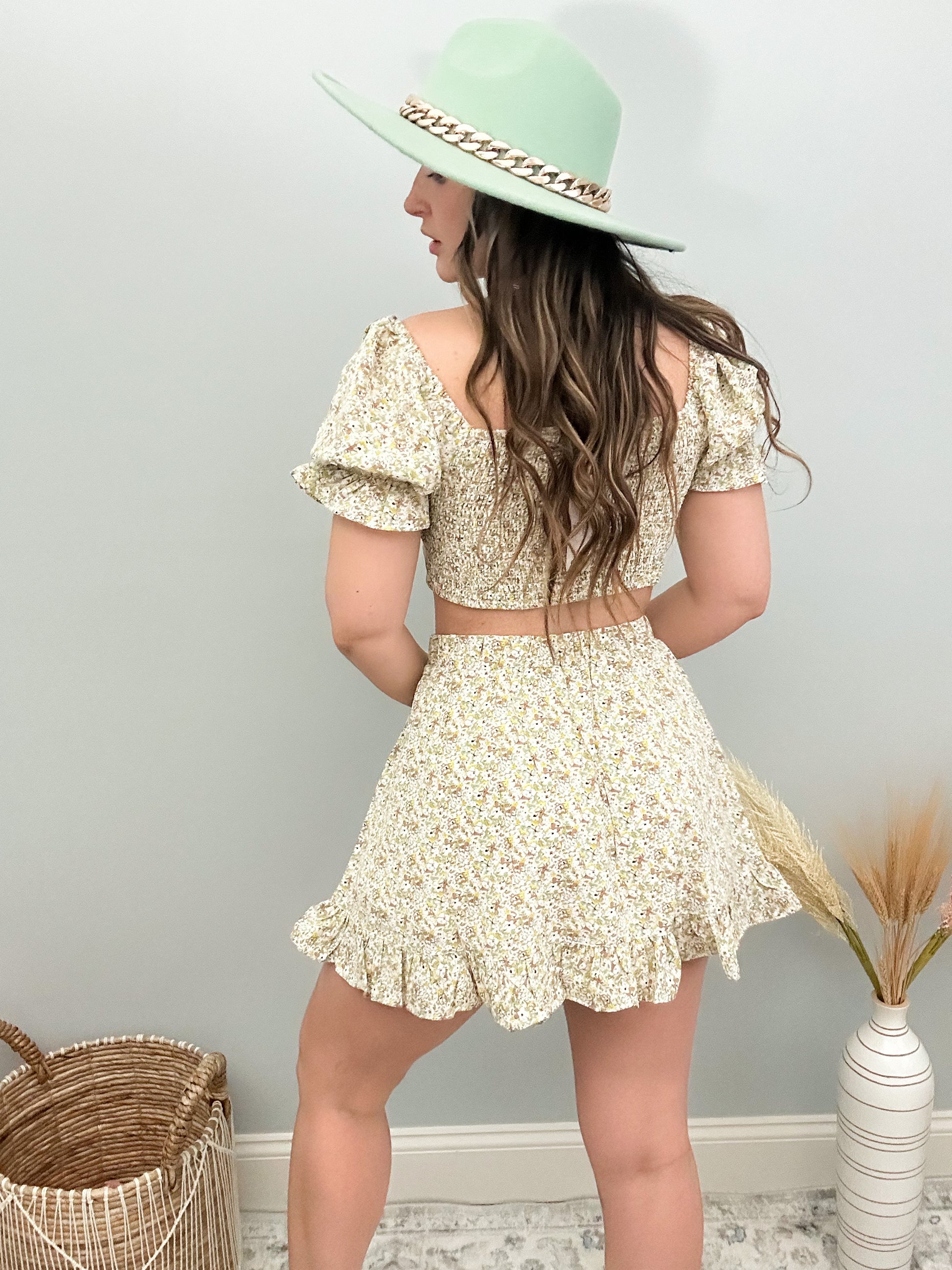 You will feel so girly in this flirty safe set featuring a lightweight skirt material, a wide and high waistline, and a ruffled and tiered silhouette that falls into a straight upper-thigh length hemline and is lined! The top is super elegant and perfect to mix and match. Features a ruched top and adorable puff sleeves.