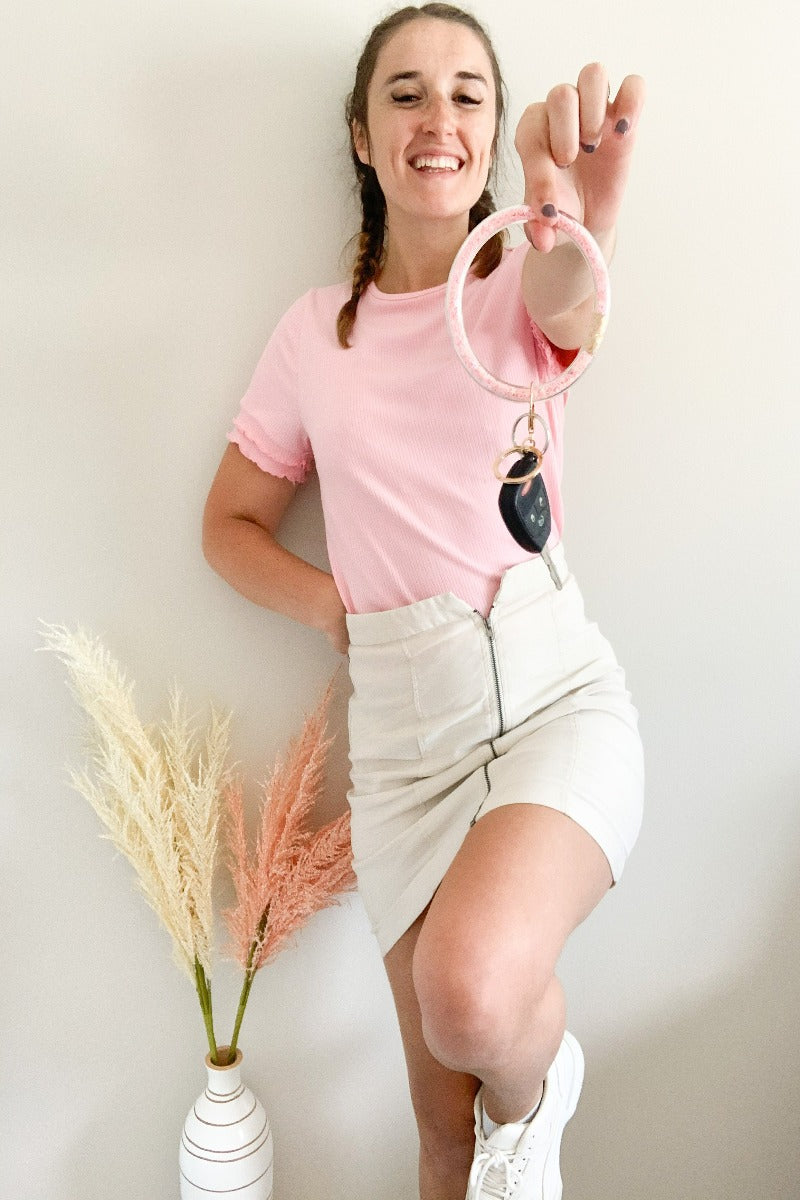 Add a sprinkle to your wardrobe and keys to look amazing when you accessorize with this adorable key chain featuring a large light pink wrist ring, gold hardware, and filled with pink confetti stars.